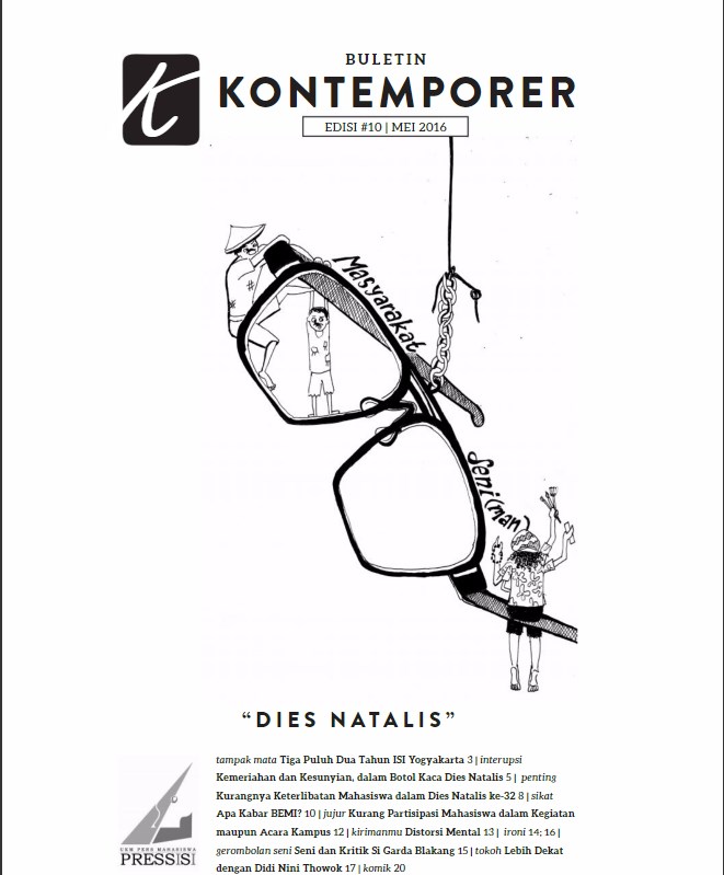 Bulan ini merupakan bulan yang membahagiakan bagi civitas akademika ISI Yogyakarta. Ya, kita semua merayakan Dies Natalis XXXII yang mengambil tema “Seni sebagai Gerakan Sosial Budaya”. Pada edisi kesepuluh ini, Buletin Kontemporer mengulas seluk beluk mengenai Dies Natalis yang akan dirayakan tahun ini, mulai dari tema, perbandingan Dies Natalis tahun ini dan yang lalu, serta keterlibatan setiap elemen civitas akademika. Pada edisi ini, kami juga akan membahas mengenai keberadaan Badan Eksekutif Mahasiswa Institut atau BEMI saat ini. Di rubrik lain, ada juga Garda Blakang, sebuah perkumpulan seni yang bergerak di bidang zine dan perform, serta tokoh Didik Nini Thowok, alumnus ISI Yogyakarta yang terkenal dengan tariannya.